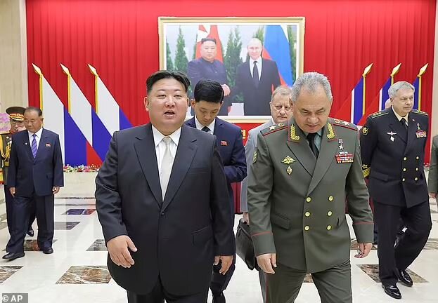 در جریان سفر سرگئی شویگو، وزیر دفاع روسیه به کره شمالی، تابلوها و پرترههای ولادیمیر پوتین بر دیوارهای مقر ریاست کیم جونگ اون، رهبر کره شمالی خبرساز شد.