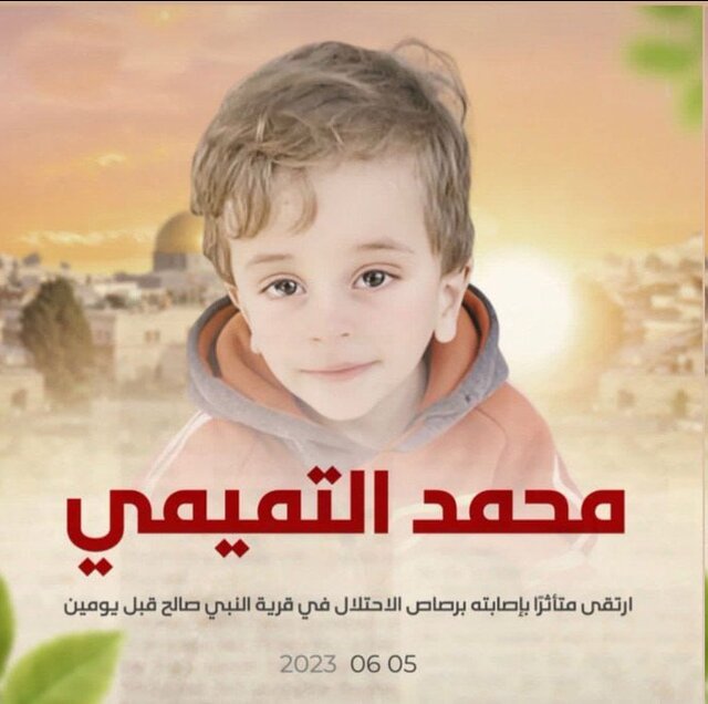 به گزارش ایسنا، محمد هیثم التمیمی (دو ساله) بر اثر گلولههای اشغالگران در خودروی پدرش مقابل خانهشان در روستای نبی صالح در شمال رام الله در کرانه باختری اشغالی به شهادت رسید.